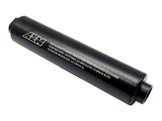 AEM's Universal High Flow -10 AN Inline Filter is specifically engineered for maximizing flow without sacrificing filtration, and is designed for ease of installation. The end caps are machined with -10AN female fittings that allow the filter to flow up to 12.32 gpm @ 45 PSI and 2.63 gpm @ 6 PSI. Machined O-ring receiver grooves on the end caps ensure against leaks, and all sealing o-rings and gaskets are made of Viton for outstanding performance when using gasoline, alcohol or gasoline/alcohol blended fuels. The commonly available replacement filter cartridges filter particles as small as 7 microns. The filter's standard 2" OD allows for easy mounting virtually anywhere in the vehicle for easy access.
