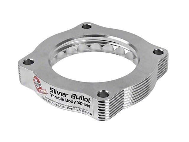 Silver Bullet throttle body spacers create turbulence in the air flow at the point just prior entry into the engine increasing horsepower, torque and improving throttle response and fuel efficiency. Silver Bullet throttle body spacers are constructed out of durable T-6061 billet aluminum and using a unique serrated/helix entry to create turbulence at the manifold while eliminating the annoying whistle found in other helix only throttle spacers.