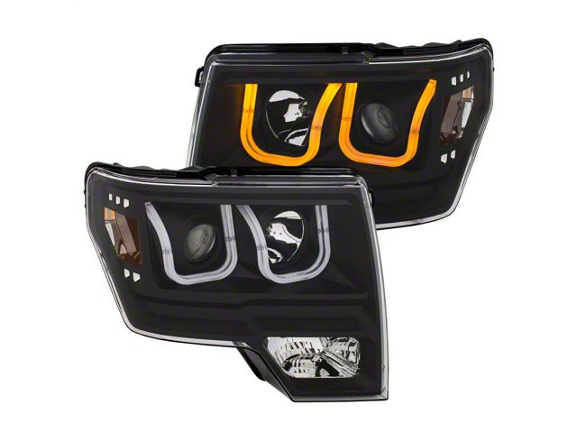 ANZO 2009-2014 Ford F-150 Projector Headlights w/ U-Bar Switchback Black w/ Amber