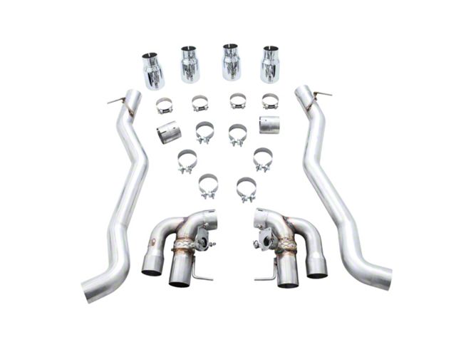In axle-back form, the SwitchPath retains the M5's factory mid-section, coming in right at the rear axle. The AWE SwitchPath Axle Back Exhaust maintains a 3" diameter, shaves weight from the rear, and retains the factory valve behavior. Available separately are the AWE Performance Mid Pipes to replace the factory mid section with a 3" stainless steel X-pipe, mating to the factory Axle Back (or AWE Axle Back, to make a full cat back). And if you're not ready to do the mid-pipes, no sweat - AWE engineered the Exhaust Suite for the M5 as a completely modular configuration that allows you to do just that, at any time. Simply add the desired configuration to your cart, and roar away. All tip options are AWE's 4" slash-cut design, and include the AWE logo and double-walling to ensure a mirror finish even under hard usage. All tips are individually adjustable, allowing depth into the bumper to be set according to personal taste.Important fitment notes: If you're equipping the Performance Mid Pipes or an Axle Back, cutting will be required. The Performance Mid Pipes + Axle Back installed together will not require cutting.