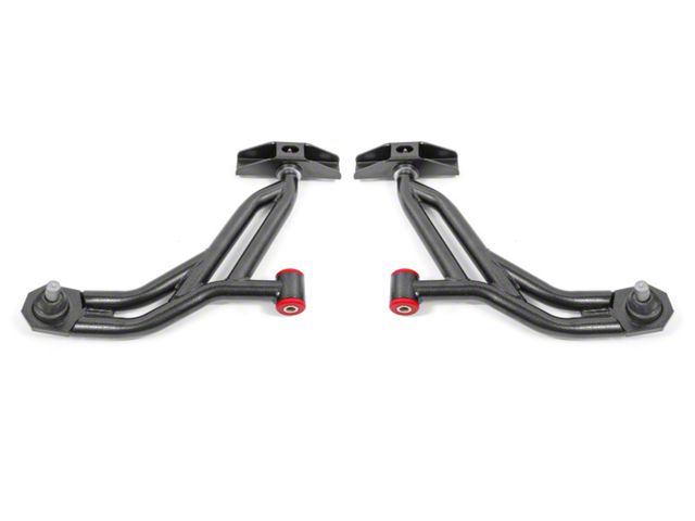 A-arms are one of the most important, yet overlooked suspension components. They are the direct link between the front wheels and the chassis. Any deflection causes a change in alignment, which results in poor performance and driving feel. Fabricated from heavy-duty 1.25-inch, 0.120-inch wall DOM tubing, deflection is eliminated with A-arms from BMR Suspension. BMRs AA754 Lower A-arms are equipped with greasable heavy-duty ball joints, 95-durometer polyurethane bushings (front mount), and greasable Delrin bushings (rear mount) to handle the high loads. Polyurethane bushings add a solid, more responsive feel over the stock rubber bushings. BMRs bushings are internally fluted, which allows grease to evenly coat the inner sleeve. These flutes also direct grease to the outer edge of the bushing, keeping the thrust surface lubricated. This efficient lubrication ensures quiet, reliable operation over the life of the bushings. The combination of poly and Delrin bushings gives you improved steering feel and responsiveness for any type of driving. BMRs AA754 lower A-arms eliminate A-arm deflection, greatly improving steering feel and response in normal and performance driving situations. The polyurethane and Delrin bushings add strength and reduce deflection over the stock rubber bushing, while still absorbing much of the NVH. The means you get a great blend of performance and comfort. Designed for street performance, drag race, and handling, and pro-touring applications, BMR lower A-arms are engineered to give you improved geometry and increased lateral grip during cornering situations. BMR Suspension AA754 Non-Adjustable Lower A-arms are available in black hammertone and red powdercoat for long-lasting good looks. Installation time is 3-4 hours. Proudly made in the U.S.A. Control arm hardware kit RH014 (Includes upper and lower control arm hardware - Highly Recommended) also available.