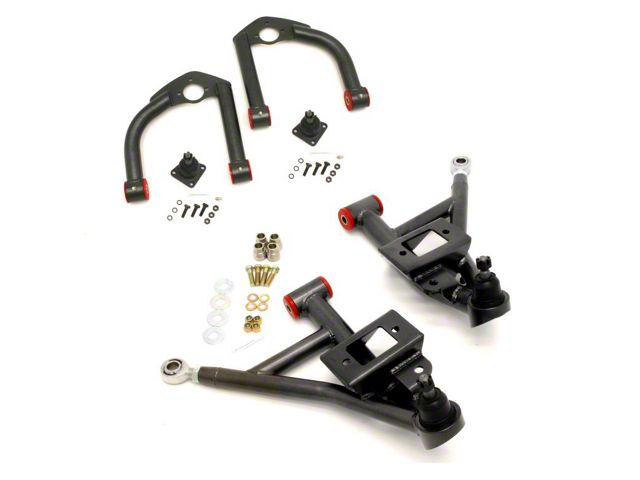 A-arms are one of the most important, yet overlooked suspension components. They are the direct link between the front wheels and the chassis. Any deflection causes a change in alignment, which results in poor performance and driving feel. Fabricated from heavy-duty 1.25-inch and 1.625-inch DOM tubing with laser-cut, CNC-formed plate steel plate, deflection is eliminated with A-arms from BMR Suspension. BMRs AA032 Upper and Lower A-arms come with new ball joints, and greasable, 95-durometer bushings, which add a solid, more responsive feel over the stock rubber bushings. BMRs bushings are internally fluted, which allows grease to evenly coat the inner sleeve. These flutes also direct grease to the outer edge of the bushing, keeping the thrust surface lubricated. This efficient lubrication ensures quiet, reliable operation over the life of the bushings. The lower A-arms also feature greasable heavy-duty ball joints, zinc-plated, X-series, heat-treated, chrome-moly, self-lubricating, Teflon-lined rod ends and greasable, 95-durometer polyurethane bushings.BMRs AA032 Upper and Lower A-arms reduce weight and eliminate A-arm deflection, greatly improving steering feel and response in normal and performance driving situations. The polyurethane bushings add strength and reduce deflection over the stock rubber bushing, while still absorbing much of the NVH. The means you get a great blend of performance and comfort for street performance, drag race, and handling applications. The AA032 uppers feature a 3 degree improved ball joint angle for lowered cars. These are compatible with all stock components.BMR Suspension AA032 Upper and Lower A-arms are available in black hammertone and red powdercoat for long-lasting good looks. Installation time is 4-5 hours. Proudly made in the U.S.A.Control arm hardware kit RH011 (Includes upper and lower control arm hardware - Highly Recommended) also available.