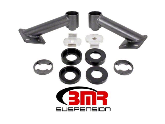 Built from 6061-T6 billet aluminum, stainless steel, and heavy-duty 1 5/8-inch DOM steel tubing, BMR's CB005 Cradle Bushing Lockout Kit is designed to nearly eliminate cradle bushing deflection, which is one of the biggest causes of wheelhop. BMR's CB005's billet aluminum upper bushing lockout rings capture the inner bushing sleeve (front and rear) and the outer lip of the bushing cup on the cradle (front). The lower bushing locating washers (front) capture the bottom portion of the bushings inner sleeves. By capturing both parts of the bushings inner sleeves, movement on any plane (fore/aft, lateral, and vertical) is nearly eliminated. This assembly is completed with bolt-on cradle braces that replace the factory sheer plates. The large lug on the cradle side of the braces positively locates the cradle, ensuring it is perfectly centered under the car. The two bolts in the frame ensure the location of the cradle can't change under any form of driving.