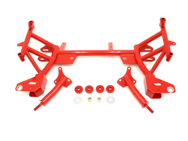 Reduce weight, increase frontend rigidity, and swap a Small-Block or Big-Block Chevy engine into your F-body with a Tubular K-members from BMR Suspension. BMR Tubular K-Members are designed to provide a lightweight alternative to the heavy and bulky factory K-member. Manufactured from 1-5/8-inch x 0.120 wall and 1-1/4-inch x 0.095 wall DOM tubing, BMRs K-members give you a lightweight, extremely strong K-member. Every BMR K-member is 100-percent bolt-in and requires no modifications for fitment. The K-members are built with provision for either factory or manual steering racks.Designed for street performance, drag race, and road race applications, BMR Suspensions Tubular K-members drop weight and add loads of structural rigidity. The unique K-member design feature integrated frame stands that replace the factory cast iron frame stands. This additional weight reduction allows BMR to use larger diameter tubing and thicker mounting plates for additional strength over other companies K-members. When combined with BMRs upper and lower A-arms, a minimum weight reduction of 42 pounds is common. With other lightweight frontend parts, weight reduction of up to 100 pounds is easily achievable. The K-member also comes with specially designed engine mounts allowing you to easily swap a SBC or BBC engine into your Fourth Gen F-body with no fabrication.BMR Suspensions KM005-1 Tubular K-Member is available in black hammertone and red powdercoat for long-lasting good looks. Installation time is about 4-5 hours. Proudly made in the U.S.A.!
