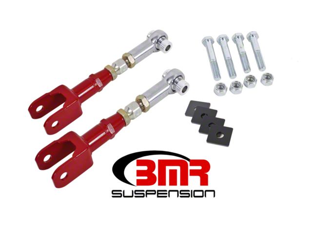 Stock stamped steel toe rods with eccentric adjustment bolts deflect under load and change the alignment of the rear wheels. BMR's on-car adjustable toe rods for S550 Mustangs (TR005) are manufactured from heavy-duty 1 1/4-inch DOM steel tubing. TIG-welded chrome-moly tube adapters with a heavy-duty center adjuster make on-car adjustments simple and easy. The open end is formed from laser cut, CNC formed 3/16-inch steel plate. The CNC-machined center adjuster has right- and left-handed threads for easy on-car adjustments. This design gives you a strong toe rod that greatly improves adjustability. The other end features zinc-plated, X-series, heat-treated, chrome-moly, self-lubricating, Teflon-lined rod ends. It also features 6061-T6 billet aluminum, custom designed rod end spacers. BMR Suspension designed the TR005 to work well in street performance, drag race, and road race applications. The stock toe rods flex under cornering loads giving you inconsistent alignment and handling characteristics. Combine this with eccentric adjustment bolts that can't handle hard launch with sticky tires, or high-horsepower applications and you're left with poor performance. The TR005 allows you to fine-tune the rear toe settings for any form of performance driving. BMR supplies lockout plates to eliminate the factory eccentric adjustment bolts. This allows you to make all of the adjustments on the toe rod. Lockouts are used to minimize toe change and deflection from the eccentric slipping and losing adjustment. Cars with more than stock horsepower levels or soft compound tires tent to push the limits of eccentric bolts in rear suspension systems. Other company's adjustable toe rods reuse the eccentric bolts, which only fix half the problem. BMR's TR005 Toe Rods are a complete solution. This is just another reason BMR's on-car adjustable toe rods are the perfect upgrade for the enthusiast looking to improve performance at an affordable price.