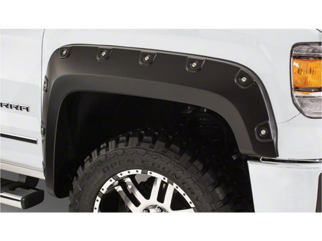With their surface-mounted stainless steel bolts and massive presence, Boss Pocket Style Fender Flares are a Bushwacker exclusive. Despite their aggressive bolt-on styling, Boss Pocket Style Fender Flares install in minutes, with no body-side drilling. They're custom-designed for your truck to complement oversized tires and high-clearance lift kits. These flares are now available pre-finished to match the paint on your new truck or SUV, plus they have the edge trim and stainless steel hardware pre-installed for quick and easy installation and a perfect fit-no drilling required. Boss Pocket Style Fender Flares are made from our thick, warp-resistant Dura-Flex 2000 material, tailor-made for added durability and flexibility on the trail. When you need maximum tire coverage with minimum time and effort, it's in the pocket. Boss Pocket Style Fender Flares from Bushwacker.
