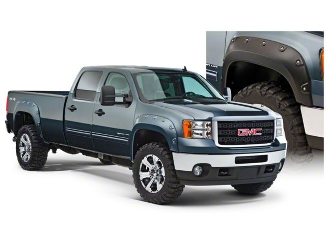 With their surface-mounted stainless steel bolts and massive presence, Boss Pocket Style Fender Flares are a Bushwacker exclusive. Despite their aggressive bolt-on styling, Boss Pocket Style Fender Flares install in minutes, with no body-side drilling. They're custom-designed for your truck to complement oversized tires and high-clearance lift kits. These flares are now available pre-finished to match the paint on your new truck or SUV, plus they have the edge trim and stainless steel hardware pre-installed for quick and easy installation and a perfect fit-no drilling required. Boss Pocket Style Fender Flares are made from our thick, warp-resistant Dura-Flex 2000 material, tailor-made for added durability and flexibility on the trail. When you need maximum tire coverage with minimum time and effort, it's in the pocket. Boss Pocket Style Fender Flares from Bushwacker.