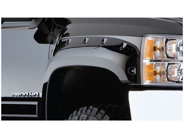 For extreme off-road use, there's nothing else like Bushwacker Cut-Out Fender Flares. Each set of Cut-Out Fender Flares is individually designed for your truck, to maximize off-road wheel travel and maintain adequate tire coverage. That custom approach means a smoother appearance, greater strength, and easier bolt-on installation with tough stainless steel hardware. Cut-Out Fender Flares are made from thick, warp-proof Dura-Flex 2000, our own proprietary material, engineered for added durability and flexibility in severe conditions. Its UV protection guards against chalking, while its pro-grade matte black finish looks great as-is, or custom painted to create your own personal look.