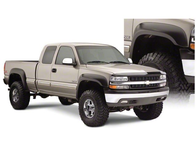 You've equipped your vehicle with oversize wheels and tires for serious off-road traction and clearance. Now you need extra tire coverage to protect your rig's body and maybe even comply with local laws. Bushwacker Extend-A-Fender Flares deliver premium-grade protection and style matched to oversized tires, yet as tough as they are, they go on easily with no drilling required. You can install them in minutes and enjoy them for years. Our exclusive Dura-Flex 2000 material is designed for added durability and flexibility with built-in UV protection. Your Extend-A-Fender Flares resist chalking, cracking, and warping, whether you leave them with their OEM-style matte black finish or paint them for a totally personalized look. Either way, your truck will look factory-equipped for your off-road tires. Extend-A-Fender Flares go on easy, perform tough, and look great.