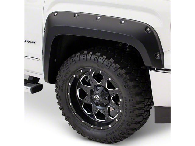 With their recessed stainless steel bolts and massive presence, Pocket Style Fender Flares are a Bushwacker original and an off-road icon. They give you the hard-core look of bolt-on flares, with no body-side sheet metal drilling required. Pocket Style Fender Flares are custom-designed for your vehicle to complement oversized tires and high-clearance lift kits. You can mount them right out of the box with their tough, OEM-style matte black finish they're UV protected so they won't chalk. You can also paint them to match or accent the body color for a factory-custom look. Pocket Style Fender Flares are made from our thick, warp-resistant Dura-Flex 2000 material and tailor-made for added durability and flexibility on the trail. When you need maximum tire coverage with minimum time and effort, it's in the pocket. Pocket Style Fender Flares from Bushwacker.