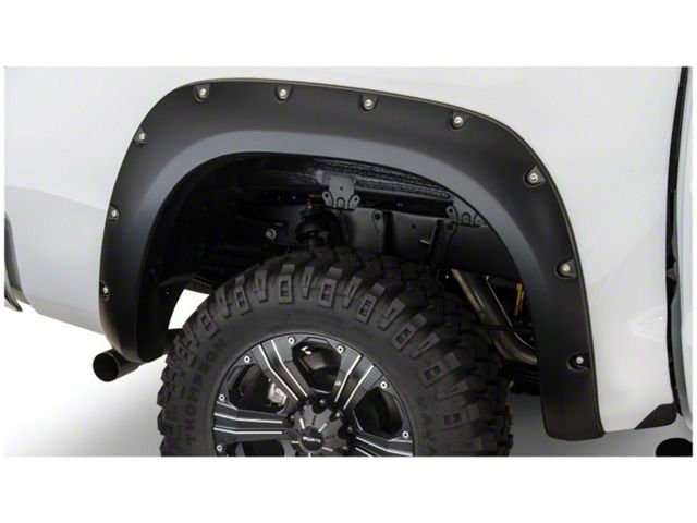 With their recessed stainless steel bolts and massive presence, Pocket Style Fender Flares are a Bushwacker original and an off-road icon. They give you the hard-core look of bolt-on flares, with no body-side sheet metal drilling required. Pocket Style Fender Flares are custom-designed for your vehicle to complement oversized tires and high-clearance lift kits. You can mount them right out of the box with their tough, OEM-style matte black finish they're UV protected so they won't chalk. You can also paint them to match or accent the body color for a factory-custom look. Pocket Style Fender Flares are made from our thick, warp-resistant Dura-Flex 2000 material and tailor-made for added durability and flexibility on the trail. When you need maximum tire coverage with minimum time and effort, it's in the pocket. Pocket Style Fender Flares from Bushwacker.