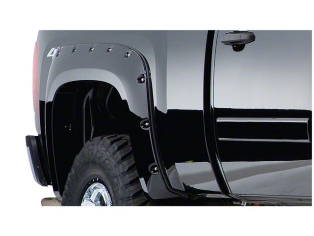 With their recessed stainless steel bolts and massive presence, Pocket Style Fender Flares are a Bushwacker original and an off-road icon. They give you the hard-core look of bolt-on flares, with no body-side sheet metal drilling required. Pocket Style Fender Flares are custom-designed for your vehicle to complement oversized tires and high-clearance lift kits. You can mount them right out of the box with their tough, OEM-style matte black finish they're UV protected so they won't chalk. You can also paint them to match or accent the body color for a factory-custom look. Pocket Style Fender Flares are made from our thick, warp-resistant Dura-Flex 2000 material and tailor-made for added durability and flexibility on the trail. When you need maximum tire coverage with minimum time and effort, it's in the pocket. Pocket Style Fender Flares from Bushwacker.