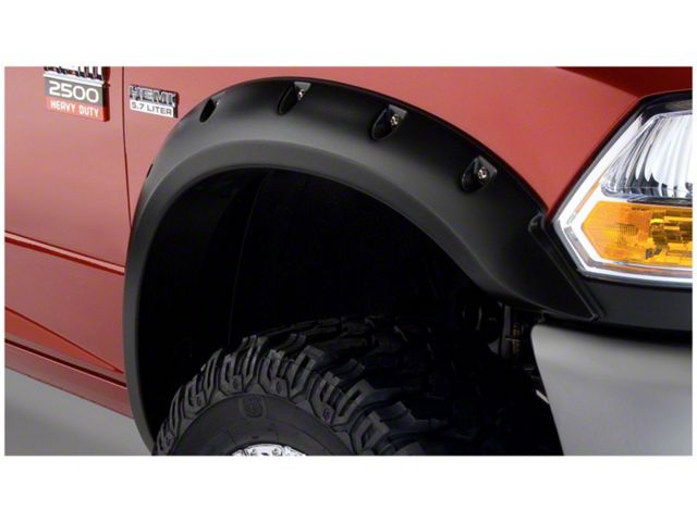 With their recessed stainless steel bolts and massive presence, Pocket Style Fender Flares are a Bushwacker original and an off-road icon. They give you the hard-core look of bolt-on flares, with no body-side sheet metal drilling required. Pocket Style Fender Flares are custom-designed for your vehicle to complement oversized tires and high-clearance lift kits. You can mount them right out of the box with their tough, OEM-style matte black finish they're UV protected so they won't chalk. You can also paint them to match or accent the body color for a factory-custom look. Pocket Style Fender Flares are made from our thick, warp-resistant Dura-Flex 2000 material and tailor-made for added durability and flexibility on the trail. When you need maximum tire coverage with minimum time and effort, it's in the pocket. Pocket Style Fender Flares from Bushwacker.