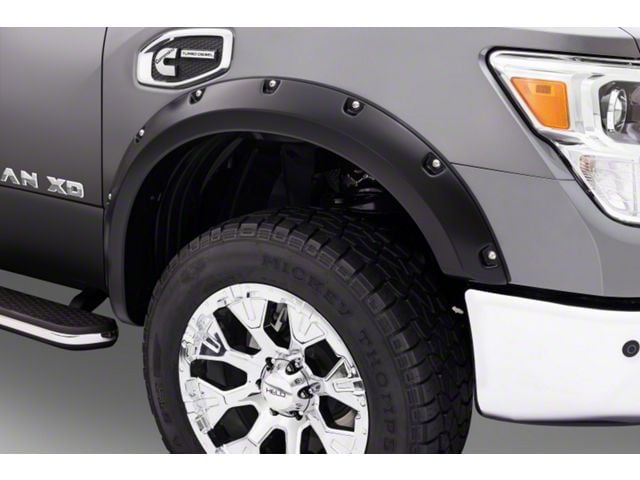 With their recessed stainless steel bolts and massive presence, Pocket Style Fender Flares are a Bushwacker original and an off-road icon. They give you the hard-core look of bolt-on flares, with no body-side sheet metal drilling required. Pocket Style Fender Flares are custom-designed for your vehicle to complement oversized tires and high-clearance lift kits. You can mount them right out of the box with their tough, OEM-style matte black finish they're UV protected so they won't chalk. You can also paint them to match or accent the body color for a factory-custom look. Pocket Style Fender Flares are made from our thick, warp-resistant Dura-Flex 2000 material and tailor-made for added durability and flexibility on the trail. When you need maximum tire coverage with minimum time and effort, it's in the pocket. Pocket Style Fender Flares from Bushwacker.