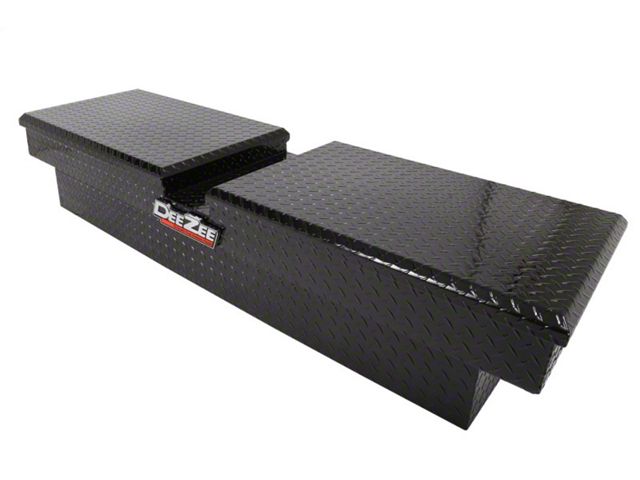 Dee Zee Tool Box - Red Label Double Lid (Gull Wing) Crossover. Constructed of heavy duty Brite-Tread aluminum. Black-Tread powder coat, provides a gloss black finish while it protects and prevents oxidation. Crown style lid for superior rigidity. Other features: lockable stainless steel paddle handles, dampened gas shocks, closed cell foam gasket, and self-adjusting strikers. Removable plastic tool tray to help keep small items organized.