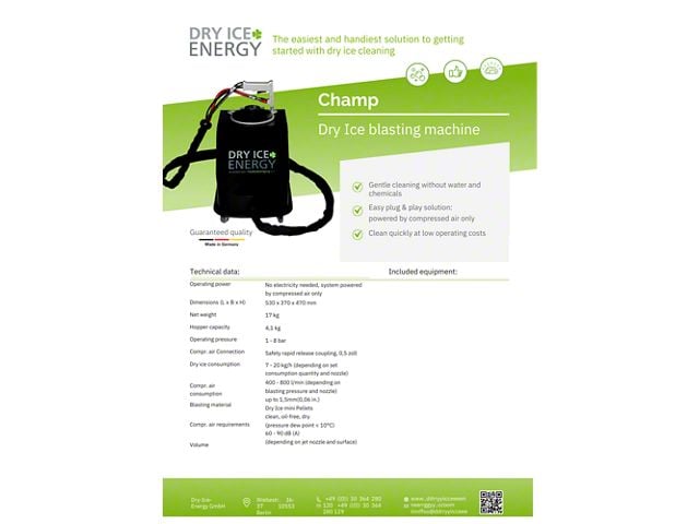 Champ impresses with its low demands on compressed air supply and low dry ice consumption while having a high cleaning performance.