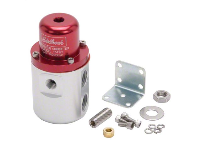 This Edelbrock fuel pressure regulator 174121 is machined from aircraft quality aluminum for those who demand the best. This carbureted fuel pressure regulator has an internal diaphragm made of fluorosilicone to ensure high temperature protection resulting in an extended life. This Edelbrock fuel pressure regulator 174121 is compatible with all grades of gasoline, ethanol, methanol and E85 fuels. Pressure regulation slope is 0.75 psi/gal of flow rate change. Will hold fuel system pressure for at least 20 minutes after pump shutdown. Developed for optimum compatibility with Edelbrock electric fuel pumps.