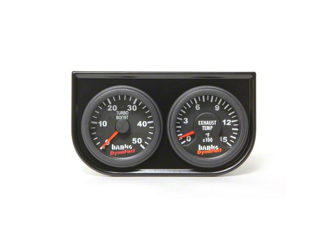Engineered Performance. Easy-to-Read DynaFact Mechanical Gauges. Pyrometer to track EGTs. Boost gauge to monitor power and turbo performance. LED backlit. Includes 2-gauge mounting panel. 1-Year Limited Warranty. Banks exclusive DynaFact gauges offer precision that can't be matched. The pyrometer provides exhaust-gas temperature (EGT) measurements that are accurate within +/-15 Degree Fahrenheit at maximum operating temperatures. The pyro spring-loaded, jeweled movement is resistant to vibration and sports a lit, easy-to-read 0-1500 Degree Fahrenheit face. Banks 0-50 psi boost gauge monitors power and turbo performance. Includes 2-gauge mounting panel. Top-mount and/or pillar-mount options available. Instrument Assembly, Pyrometer and Boost gauge
