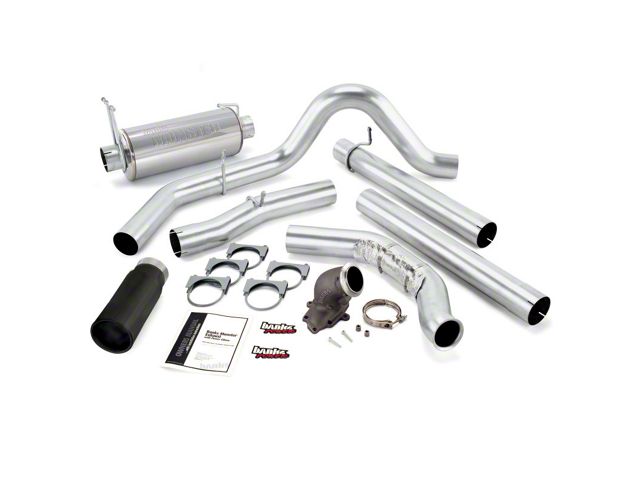4-inch constant-diameter pipes with Straight-thru muffler. Cuts back pressure up to 81 Percent. Retains stock catalytic converter. 5-inch Cerakote Black Tip Includes Power Elbow. F-250 and F-350 PICKUPS and EXCURSIONS: Banks 4 inch Monster turbo-back stainless steel exhaust features streamlined turbine-outlet pipe, intermediate pipe and tailpipe all formed of stainless, heavy-wall tubing with constant-diameter bends to maximize flow, lower exhaust gas temps and slash backpressure up to 81 percent. (Available with or without a cast, large-bore Power Elbow housing). Designed to retain stock catalytic converter. The polished-stainless Monster muffler features a straight-through 4 inch diameter flow-path with a Banks-designed expansion chamber to dissipate the annoying mid-range exhaust drone that affects most straight-through designs. The muffler utilizes spun ceramic, very-high-temperature packing, more than doubles stock exhaust flow, and delivers an authoritative - but never intrusive - exhaust sound. And the 5 inch polished rolled-edge tip has an adjustable clamp for positioning on tailpipe. Get it in your choice of chrome-over stainless or high temp black! See this system with the black tip and no Power Elbow. (And to help keep it looking good, there's a 1/2 inch air gap to keep heat from tarnishing the finish). Important: Some vehicle configurations require an extension kit for proper fit. Pickups other than standard-cab long-bed or extended-cab short-bed require Exhaust Extension Kit. Extended Cab Long Bed #53517 required, Crew Cab Short Bed #53516 required, Crew Cab Long Bed #53518 required.