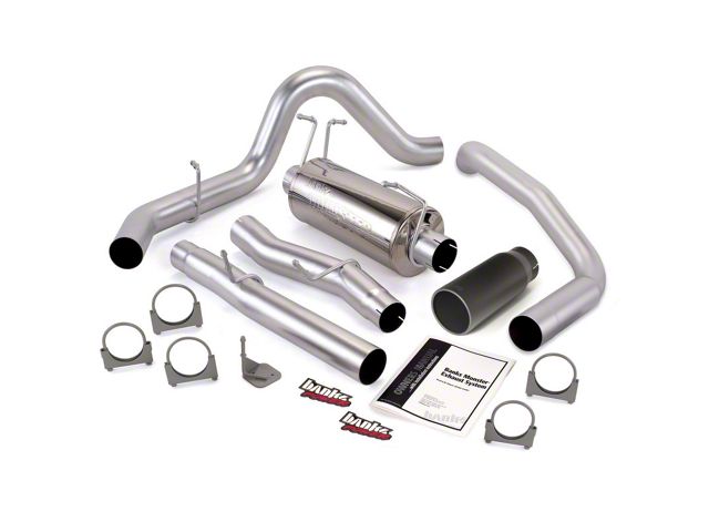 Nearly doubles flow. 4-inch constant-diameter pipes with Straight-thru muffler. Includes 5-inch polished Chrome-over stainless or high-temp Cerakote Black rolled edge tip. 4 inch stainless constant-diameter pipes and straight-thru muffler nearly doubles flow. Lower exhaust temps, virtually no backpressure, rich, throaty sound. Available for F-250, F-350, F-450 and F-550 Pickup and Excursion. Monster exhaust system flows up to 91.5 percent better than stock and virtually eliminates backpressure. The streamlined 4 inch intermediate pipe(s) and tailpipe are formed of stainless, heavy-wall tubing with constant-diameter bends to maximize flow and lower exhaust gas temps. Banks replaces the factory's restrictive muffler with a polished-stainless steel Monster muffler, featuring a straight-through 4 inch diameter flow-path with a Banks-designed expansion chamber which dissipates the annoying mid-range exhaust drone that's so prominent in competitors' straight-through mufflers. The muffler utilizes spun ceramic, very-high-temperature packing, more than doubles the stock flow and delivers an authoritative - but never intrusive - exhaust sound. Includes a 3.5 inch turbine outlet pipe (T.O.P.). A huge 5 inch stainless steel tailpipe tip in your choice of polished chrome-over stainless or high-temp Black sports a rolled edge. And to help keep it looking good, there's a 1/2 inch air gap to keep heat from tarnishing the finish. An adjustable clamp lets you position it on the tailpipe just right. Automatic Transmission only, for Manual Transmission use the Banks Monster Sport Exhaust.