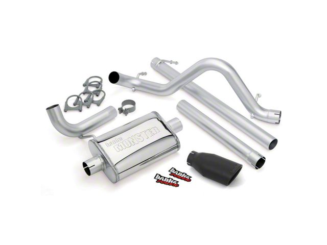 Huge 2.5 inch stainless mandrel-bent tailpipe with a polished tip. Straight-thru Monster muffler flows up to 119 percent better than stock. Slashes backpressure, rich, authoritative sound. Constructed of heavy-gauge stainless steel, Banks Monster features a supersized, 2.5 inch tailpipe with a stainless tailpipe tip polished to a mirror finish - or choose the new Black tip! Monster Muffler, Banks straight-through performance muffler, is the industry's least restrictive, more than doubling the stock flow. Monster virtually eliminates backpressure from the catalytic converter back, for more power and efficiency - and an authoritative, yet civil, exhaust note. Available for 2-door and 4-door models. Includes: Stainless Monster muffler, Stainless 2.5 inch tailpipe, Polished Chrome or Black stainless tailpipe tip, Mounting hardware.