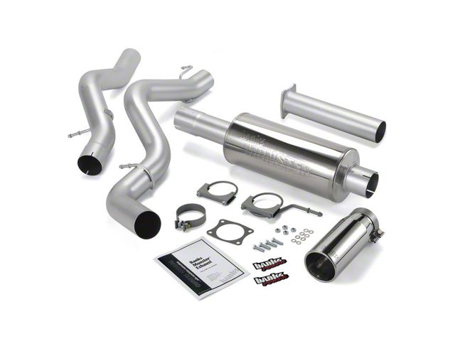 100 Percent stainless, not aluminized! Improves flow up to 176 Percent. Cat Back System with giant polished Chrome rolled-edge tip. Muffler's expansion chamber cuts the drone. Physical fitment. Why consider a cheap, ill-fitting aluminized exhaust? Banks 4 inch Monster Exhaust is made of rugged, long-lasting 100 percent stainless steel. It fits better than the competition, because Monster Exhaust utilizes the factory hangers and maintains proper clearance to all under-vehicle components. All flow, show and go! With nearly five decades of engineering airflow improvements, Banks has mastered the art of maximizing flow while minimizing backpressure. The polished straight-through Monster Muffler, mandrel-bent head pipe assembly (non-cat-converter-equipped vehicles only), intermediate pipe(s) and tailpipe nearly triple the exhaust flow, cut backpressure up to 98 percent, lower exhaust gas temps and deliver more power to the ground. And the 5 inch polished rolled-edge tip has an adjustable clamp for positioning on tailpipe. Get it in your choice of chrome-over stainless or high temp black! Engineered to ditch the drone. Many straight-through mufflers deliver an obnoxious drone that overpowers conversations. Banks Monster Muffler is extensively sound-tested and engineered with a unique expansion chamber and high-temperature packing. Instead of a drone, you're treated to a rich exhaust note that's authoritative, yet civil. It sounds as great as it looks! 4 inch stainless constant-diameter pipes and straight-thru muffler improve flow up to 176 percent and lower EGTs. Cuts backpressure up to 98 percent, rich throaty sound.