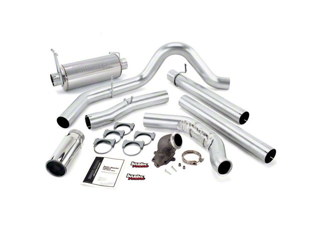 4-inch constant-diameter pipes with Straight-thru muffler. Cuts back pressure up to 81 Percent. Turbo Back System with 5-inch Chrome tip. Includes Power Elbow. EXCURSIONS: Banks 4 inch Monster turbo-back stainless steel exhaust features streamlined turbine-outlet pipe, intermediate pipe and tailpipe all formed of stainless, heavy-wall tubing with constant-diameter bends to maximize flow, lower exhaust gas temps and slash backpressure up to 81 percent. (Available with or without a cast, large-bore Power Elbow housing.). The polished-stainless Monster muffler features a straight-through 4 inch diameter flow-path with a Banks-designed expansion chamber to dissipate the annoying mid-range exhaust drone that affects most straight-through designs. The muffler utilizes spun ceramic, very-high-temperature packing, more than doubles stock exhaust flow, and delivers an authoritative - but never intrusive - exhaust sound. And the 5 inch polished rolled-edge tip has an adjustable clamp for positioning on tailpipe. Get it in your choice of chrome-over stainless or high temp black! (And to help keep it looking good, there's a 1/2 inch air gap to keep heat from tarnishing the finish.).