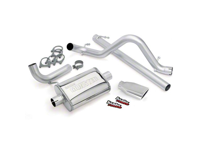 Huge 2.5 inch stainless mandrel-bent tailpipe with a polished tip. Straight-thru Monster muffler flows up to 119 percent better than stock. Slashes backpressure, rich, authoritative sound. Constructed of heavy-gauge stainless steel, Banks Monster features a supersized, 2.5 inch tailpipe with a stainless tailpipe tip polished to a mirror finish - or choose the new Black tip! Monster Muffler, Banks straight-through performance muffler, is the industry's least restrictive, more than doubling the stock flow. Monster virtually eliminates backpressure from the catalytic converter back, for more power and efficiency - and an authoritative, yet civil, exhaust note. Available for 2-door and 4-door models. Includes: Stainless Monster muffler, Stainless 2.5 inch tailpipe, Polished Chrome or Black stainless tailpipe tip, Mounting hardware.