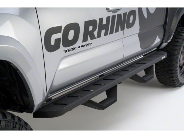 The legendary RB Series of cab length running boards from Go Rhino will make your truck, Jeep or SUV stand apart from the crowd. With an aggressive, yet stylish appearance, these bolt-on steps take their visual inspiration from the Ford Raptor but are made for more than just looks. The RB10 features a generous step area with Raptor-style louvers for maximum traction. The corrosion-resistant 16-gauge zinc coated steel steps are mounted high and tight, giving them plenty of clearance for off-road adventures, and are strong enough to support hundreds of pounds. The RB10 is offered in textured black powder coat or rugged, bedliner coating. One or two pairs of drop steps will make entering and exiting lifted vehicles even easier. Hardware and brackets are included. RB10 Running Boards With Drop Steps come with a Limited Lifetime warranty on materials and construction and a 5 year warranty on the Bedliner finish.