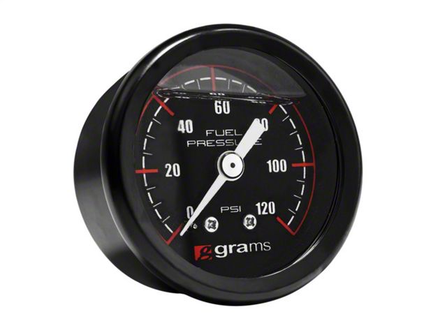 Compliment your fuel regulator with the Grams fuel pressure gauge. This easy to read, matte black stainless steel gauge measures 0-120 psi (8.27 bar) and is glycerin filled to accommodate applications with the highest vibrations. While adjusting the regulator, the Grams Fuel Pressure Gauge will provide you an accurate fuel pressure reading at a glance.