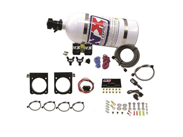 The Nitrous Express Viper Plate System includes a billet aluminum nitrous plate that fits between the throttle bodies and intake manifold making installation quick, easy, and attractive. This system includes 10lb Bottle with Lightning 500 valve, Pro Power Lightning series billet aluminum and carbon fiber solenoids, 24in SHO braided stainless lines from solenoid to plate, master arming switch, TPS activated WOT module (for use with fly by wire throttle bodies), as well as every nut, bolt and electrical connector needed to complete the installation. This system includes jetting for 50, 100, 150, 200, 250, 300, 350, and 400hp. This system is configured as a single stage system by default with 50-400hp jetting. This system includes the latest technology and the best components available. NX Lightning solenoids feature an improved flow path that eliminates sharp turns and expansion areas in the nitrous flow path. This keeps the nitrous in dense liquid form which makes more power on less nitrous. Lightning nitrous solenoids feature an integrated purge port which allows you to connect a purge valve directly to the body of the nitrous solenoid for clean looks and less plumbing. Lightning Series solenoids feature CNC aluminum bodies topped with Carbon Fiber cans for the ultimate in weight savings.