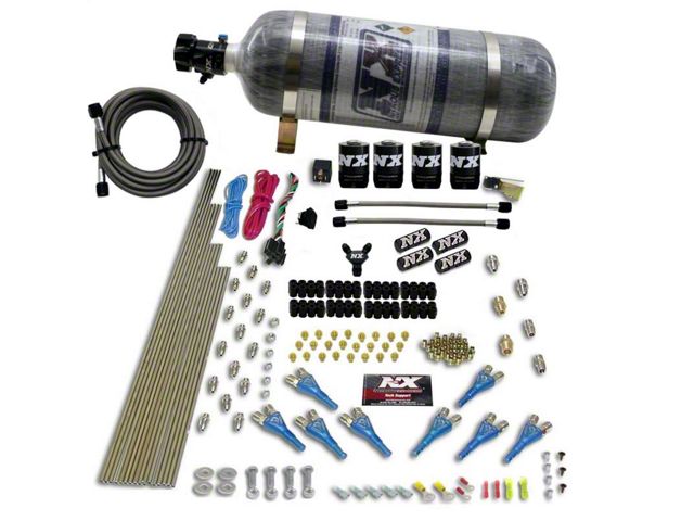 This system includes 8 of the patented NX Shark Nozzles, 2 NX Lightning series nitrous solenoids, 2 NX Lightning series fuel solenoids, anodized aluminum distribution blocks, 3/16 stainless hard lines, nickel plated fittings, Jetting for 2006AN00HP, 6AN stainless braided nitrous feed lines, a high flow 6AN Y fitting, a wide open throttle switch, 40 Amp relays and relay harnesses, master arming switch and every nut, bolt and connector needed to complete the installation. This system includes the latest technology and the best components available. For you tech hungry junkies we will provide some details explaining what makes this nitrous system so great. The key to maximizing nitrous horsepower is to keep the nitrous in a dense liquid form until it is injected into the engine. Sharp bends in the nitrous flow path cause the nitrous flow to become turbulent which causes gaseous bubbles to form in the flowing nitrous. Dense liquid nitrous makes more power than gaseous nitrous Period! This NX nitrous system contains the key components that ensure you are getting maximum power per pound of nitrous used.
