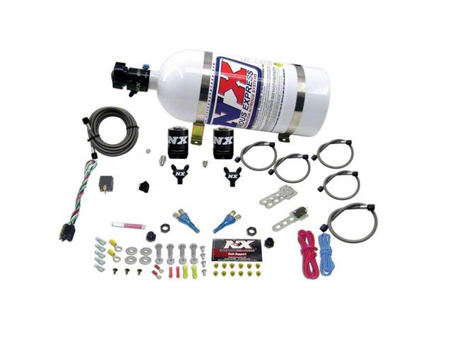 This system works on all fuel injected BMWs. The dual Shark nozzles give adjustability from 50 to150 or 50 to 300 wheel horsepower. System comes complete with 5, 10, 10lb composite or 15lb nitrous bottle, stainless bottle bracket, Lightning solenoids, extra long stainless braided N2O line, and all necessary hardware to complete the installation.