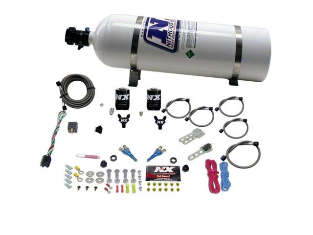 This system works on all fuel injected BMWs. The dual Shark nozzles give adjustability from 50 to150 or 50 to 300 wheel horsepower. System comes complete with 5, 10, 10lb composite or 15lb nitrous bottle, stainless bottle bracket, Lightning solenoids, extra long stainless braided N2O line, and all necessary hardware to complete the installation.
