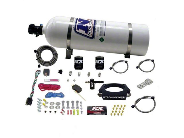 The Nitrous Express C8 plate systems feature Spraybarless technology for the ultimate in atomization and distribution. The billet plate bolts between the throttle body and intake making installation quick and easy. The solenoids are integrated into the plate for a super clean look and easy install. A direct-plug-in Fuel Line Adapter is provided to simplify installation (no need to cut your factory fuel lines). This system includes a TPS Autolearn switch so the nitrous only activates at wide open throttle and automatically turns off when you let your foot off the accelerator. The system includes jetting for 35, 50, 75, 100, 125, 150, 200, 250, and 300 horsepower. Systems include a stainless braided N2O line, master arming switch, relay, relay harness and all necessary hardware to complete the installation. Systems ordered with a nitrous bottle include the new billet aluminum Lightning 45 bottle valve and stainless bottle brackets.