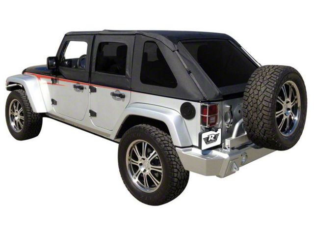 The Rampage Frameless Trail Top installs over the original equipment factory roll bar for a snug fit. This unique design allows for larger side windows and improved visibility with removable side and rear windows that quickly convert the soft top into an open Safari top. Windows use heavy duty molded tooth zippers and are easily replaced or removed. The windows are also stored in a special separation panel between the ceiling and roof top which is concealed to protect the windows from scratches or puncture. The fastback style offers improved aerodynamics and a quieter ride than factory bow style tops. The windshield channel, door surrounds and tail gate bar are required. These can be purchased separately.