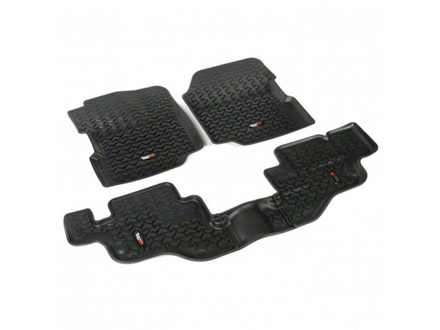 Need an affordable solution to keep the cabin floors of your Jeep looking factory fresh? Try Rugged Ridges All Terrain Floor Liners! Made of a durable OE-quality thermoplastic material that can withstand the rigor of daily abuse, each liner is perfectly contoured to your vehicles floor for precise secure fitment (floor hook attachment where applicable). The raised lip captures all spills, water and debris keeping your interior pristine. Features a chevron shape patented deep tread technology. Patent 8,163,369, D627,285, 2,699,641