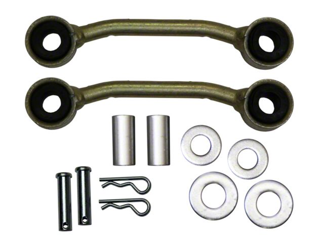 Skyjackers End Links are custom-engineered to drop your sway bar down to the perfect location. Get maximum anti-roll and sway control for better, safer handling on both smooth streets and rough trails. Built using only hard-wearing 4140H steel and finished with a durable zinc coating to block rust, corrosion, and oxidation. New polyurethane bushings included to replace worn factory rubber. These Skyjacker Sway Bar End Links directly replace your stock end links so installation is simple and fast. Minor drilling may be required on some vehicles.