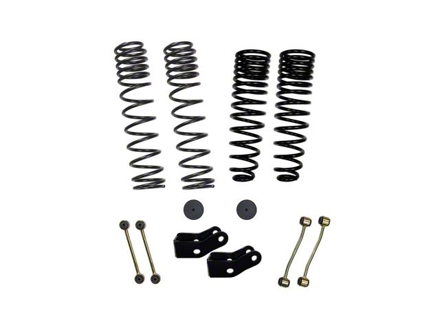 To reach new heights, you have to liberate yourself. Get some off-road freedom by going bigger in a better way. Your Gladiator JT Mojave will gain more ground clearance and conquer more terrain with larger 35 in. tires. You can keep your Jeep engineered special internal-bypass shocks and hydraulic jounce bumpers, yet still upgrade the OEM coils to an optimum performance option. The key to obtaining more lift height and keeping your stock-like ride is Skyjacker's coil springs. Skyjacker specifically engineered a progressive variable rate coil spring, distinctively a 2-stage dual rate long travel coil. Spring rate progression is from a 1st Flex Rate to a 2nd Ride Rate. The 1st Flex Rate stage of the coil spring delivers a comfortable ride with the ability to flex for increased articulation. The coil spring flex rate expands during full articulation as the suspension drops (full droop). This keeps the coil springs seated in the upper coil mount/bucket and the tires in contact with the terrain. The 2nd Ride Rate stage only engages after compression past the flex rate. Engineered to coordinate with the Gladiator's OEM unique handling characteristics, the rear coils are designed with a higher, stronger 2nd Ride Rate to handle the payload and to address large impact absorption at higher speeds. Whether you pull it or pack it, the 2nd rate allows ride control and stability for added weight activities like overlanding and towing. Front 2 in. Bump Stop Spacers bolt onto the axle bump pad and retains the OEM function of the hydraulic jounce bumpers. Front Shock Extension Relocation Brackets reposition your factory remote-reservoir shocks. Extended Length Sway Bar End Links allow full articulation as the suspension drops (full droop). The front end links include Skyjacker installed pressed-in HD OEM style rubber bushings. The rear end links come with press-in Poly bushings. Both sets are Zinc plated for corrosion protection.