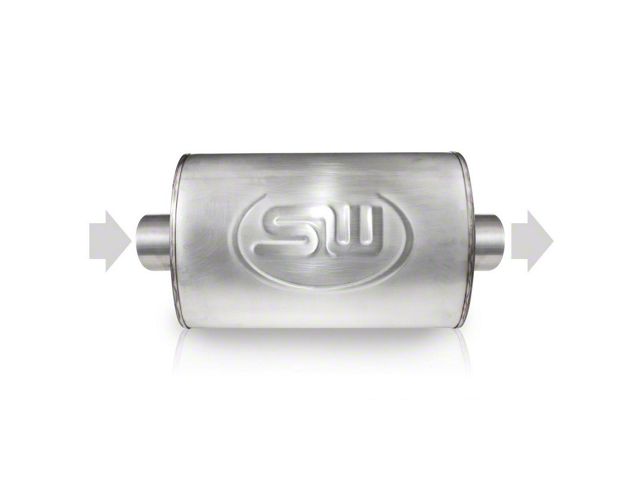Turbo S-tube muffler, Made from 304 stainless steel for maximum corrosion resistance. This muffler has 2" ID center inlet and a 2" OD center outlet with a 2" core and shell size 4" x 8" x 14" with an overall length of 18" with a mill finish. Stainless Works is the only manufacturer to make the body, core, and packing out of 304 stainless steel. Exclusive louvered core creates a sweet "Street Rod" deep tone that is very aggressive. These are TIG welded for strength and durability. These kits come with a lifetime warranty and proudly made in the USA.