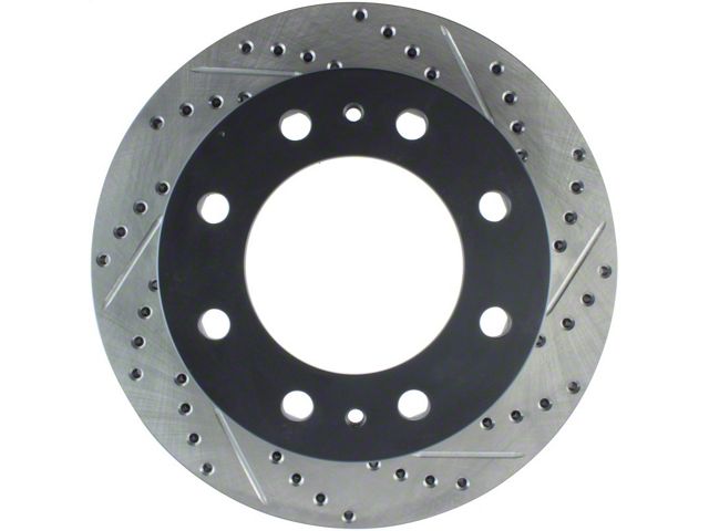 StopTech Drilled and Slotted Sport Rotors are 1-piece direct replacement brake discs for factory brake systems and stock calipers that look great behind your wheels and offer significantly improved braking performance. The unique cross-drilling and slotting aids with heat and brake dust dispersal, prevents glazing of the pads, adds bite and improves wet and dry braking performance. Built to last, the black e-coating provides protection from corrosion and the high carbon metallurgy (in most applications) offers quieter operation, better crack resistance and increased performance.