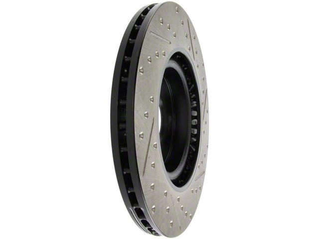 StopTech Drilled and Slotted Sport Rotors are 1-piece direct replacement brake discs for factory brake systems and stock calipers that look great behind your wheels and offer significantly improved braking performance. The unique cross-drilling and slotting aids with heat and brake dust dispersal; prevents glazing of the pads; adds bite and improves wet and dry braking performance. Built to last; the black e-coating provides protection from corrosion and the high carbon metallurgy (in most applications) offers quieter operation; better crack resistance and increased performance.