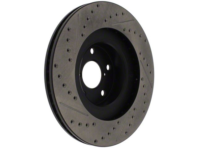 StopTech Drilled and Slotted Sport Rotors are 1-piece direct replacement brake discs for factory brake systems and stock calipers that look great behind your wheels and offer significantly improved braking performance. The unique cross-drilling and slotting aids with heat and brake dust dispersal; prevents glazing of the pads; adds bite and improves wet and dry braking performance. Built to last; the black e-coating provides protection from corrosion and the high carbon metallurgy (in most applications) offers quieter operation; better crack resistance and increased performance.