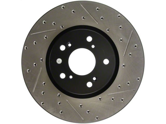 StopTech Drilled and Slotted Sport Rotors are 1-piece direct replacement brake discs for factory brake systems and stock calipers that look great behind your wheels and offer significantly improved braking performance. The unique cross-drilling and slotting aids with heat and brake dust dispersal; prevents glazing of the pads; adds bite and improves wet and dry braking performance. Built to last; the black e-coating provides protection from corrosion and the high carbon metallurgy (in most applications) offers quieter operation; better crack resistance and increased performance.