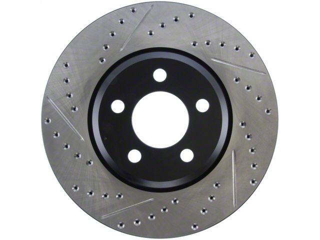 StopTech Drilled and Slotted Sport Rotors are 1-piece direct replacement brake discs for factory brake systems and stock calipers that look great behind your wheels and offer significantly improved braking performance. The unique cross-drilling and slotting aids with heat and brake dust dispersal, prevents glazing of the pads, adds bite and improves wet and dry braking performance. Built to last, the black e-coating provides protection from corrosion and the high carbon metallurgy (in most applications) offers quieter operation, better crack resistance and increased performance.