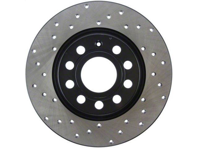 StopTech Drilled Sport Rotors are 1-piece direct replacement brake discs for factory brake systems and stock calipers that look great behind your wheels – and offer significantly improved braking performance. The unique cross-drilling aids with heat and brake dust dispersal, prevents glazing of the pads, adds bite and improves wet and dry braking performance. Built to last, the black e-coating provides protection from corrosion and the high carbon metallurgy (in most applications) offers quieter operation, better crack resistance and increased performance.