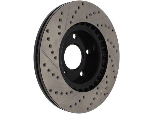 StopTech Drilled and Slotted Sport Rotors are 1-piece direct replacement brake discs for factory brake systems and stock calipers that look great behind your wheels and offer significantly improved braking performance. The unique cross-drilling and slotting aids with heat and brake dust dispersal, prevents glazing of the pads, adds bite and improves wet and dry braking performance. Built to last, the black e-coating provides protection from corrosion and the high carbon metallurgy (in most applications) offers quieter operation, better crack resistance and increased performance.