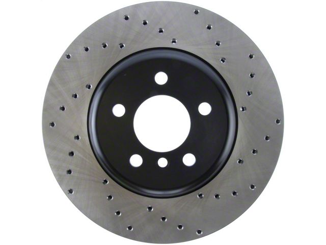 StopTech Drilled Sport Rotors are 1-piece direct replacement brake discs for factory brake systems and stock calipers that look great behind your wheels and offer significantly improved braking performance. The unique cross-drilling aids with heat and brake dust dispersal, prevents glazing of the pads, adds bite and improves wet and dry braking performance. Built to last, the black e-coating provides protection from corrosion and the high carbon metallurgy (in most applications) offers quieter operation, better crack resistance and increased performance.