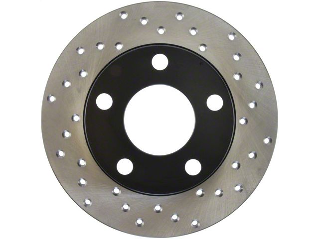 StopTech Drilled Sport Rotors are 1-piece direct replacement brake discs for factory brake systems and stock calipers that look great behind your wheels and offer significantly improved braking performance. The unique cross-drilling aids with heat and brake dust dispersal, prevents glazing of the pads, adds bite and improves wet and dry braking performance. Built to last, the black e-coating provides protection from corrosion and the high carbon metallurgy (in most applications) offers quieter operation, better crack resistance and increased performance.