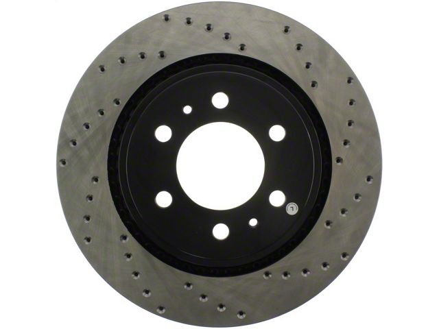 StopTech Drilled Sport Rotors are 1-piece direct replacement brake discs for factory brake systems and stock calipers that look great behind your wheels – and offer significantly improved braking performance. The unique cross-drilling aids with heat and brake dust dispersal, prevents glazing of the pads, adds bite and improves wet and dry braking performance. Built to last, the black e-coating provides protection from corrosion and the high carbon metallurgy (in most applications) offers quieter operation, better crack resistance and increased performance.
